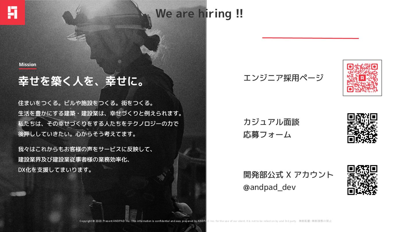 and was prepared by ANDPAD Inc. for the use of our client. It is not to be relied on by and 3rd party. 無断転載・無断複製の禁止 幸せを築く人を、幸せに。 住まいをつくる。ビルや施設をつくる。街をつくる。 生活を豊かにする建築・建設業は、幸せづくりと例えられます。 私たちは、その幸せづくりをする人たちをテクノロジーの力で 後押ししていきたい。心からそう考えてます。 我々はこれからもお客様の声をサービスに反映して、 建設業界及び建設業従事者様の業務効率化、 DX化を支援してまいります。 Mission We are hiring !! カジュアル面談 応募フォーム 開発部公式 X アカウント @andpad_dev エンジニア採用ページ