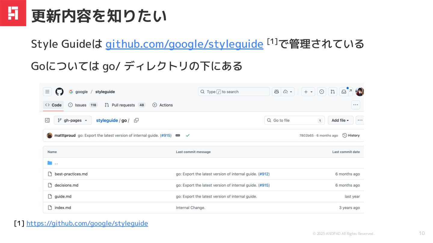 Style Guideは不定期に更新されている ◦ 更新はgithub.com/google/styleguide[1] のgo/ディレクトリ配下を確認すればわかる ◦ Go言語の機能追加にそった内容以外にも説明が追加されたり、方針が変わっていたりするこ とがある • Go Style Guide以外にもいくつか参考になりそうなガイドが存在している [1] https://github.com/google/styleguide