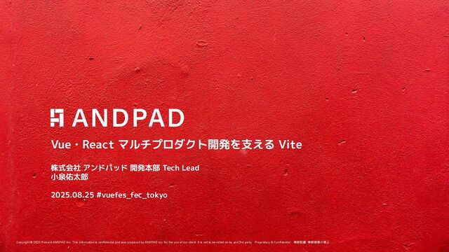and was prepared by ANDPAD Inc. for the use of our client. It is not to be relied on by and 3rd party. Proprietary & Confidential 無断転載・無断複製の禁止 Vue・React マルチプロダクト開発を支える Vite 株式会社 アンドパッド 開発本部 Tech Lead 小泉佑太郎 2025.08.25 #vuefes_fec_tokyo