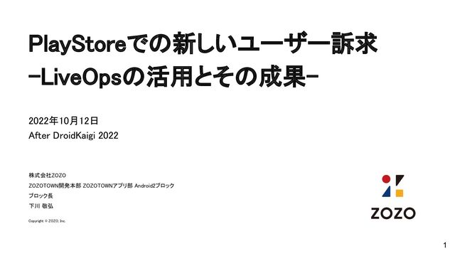 PlayStoreでの新しいユーザー訴求 -LiveOpsの活用とその成果- 2022年10月12日 After DroidKaigi 2022 株式会社ZOZO ZOZOTOWN開発本部 ZOZOTOWNアプリ部 Android2ブロック