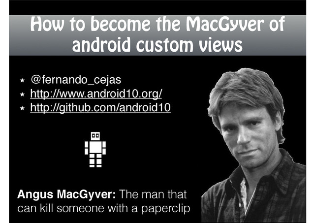 He can turn a bicycle frame into a blowtorch, disarm a bomb with a hockey ticket, create a time machine with some duct tape and a paper clip or CREATE A CUSTOM VIEW IN ANDROID.