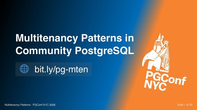 Let’s explore 6 Postgres database design patterns for an efficient and scalable multi-tenant database for use with a web application. Each pattern will be demonstrated as runnable SQL via psql on a local instance using a narrated and interactive style. Additionally, the code will be available on GitHub so that attendees can run it themselves and provide feedback. Because we’re using community Postgres and no third-party extensions, the design patterns run anywhere Postgres runs, from cloud providers to self-hosted instances.