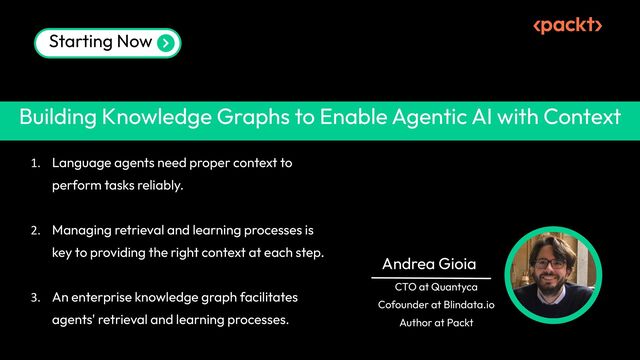 2. Managing retrieval and learning processes is key to providing the right context at each step. 3. An enterprise knowledge graph facilitates agents' retrieval and learning processes. Building Knowledge Graphs to Enable Agentic AI with Context Andrea Gioia Starting Now CTO at Quantyca Cofounder at Blindata.io Author at Packt