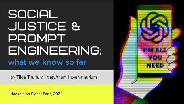 Large language models are only as good as the data we feed into them. Unfortunately, we haven't quite dismantled racism, sexism, and all the other -isms just yet. AI isn't going away, so let's apply a harm reduction lens. Given the imperfect tools that we have, how can we write LLM prompts that are less likely to reflect our own biases? In this session, Tilde will review current literature about LLM prompting and social justice. They'll compare how different models perform in this context, since they're trained on different datasets. You'll leave with some ideas that you can apply as both users and builders of LLM applications, to iterate towards a more equitable world.