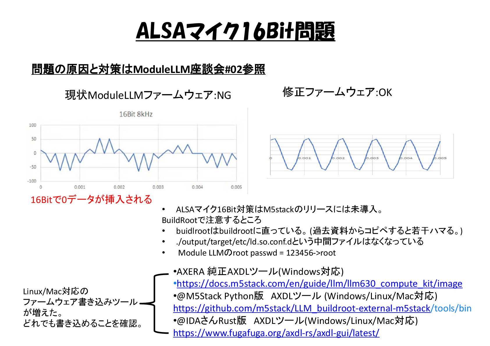 ALSAマイク16Bit問題 現状ModuleLLMファームウェア:NG 修正ファームウェア:OK • ALSAマイク16Bit対策はM5stackのリリースには未導入。 BuildRootで注意するところ • buidlrootはbuildrootに直っている。 (過去資料からコピペすると若干ハマる。) •
