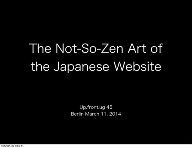 Oceans of text, long load times; Japanese websites are hardly minimal and often not user-friendly. But why are Japanese websites, so, well... Japanese? The answer is very much cultural and only a little bit technical. This talk will provide a foot in the sliding shoji door of the sometimes frustrating, but fascinating world of Japanese websites and frontend.