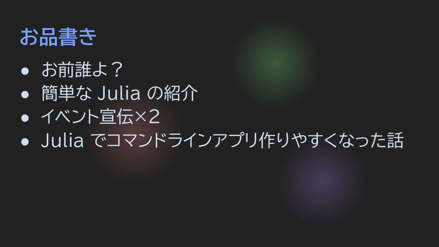 お品書き • お前誰よ? • 簡単な Julia の紹介 • イベント宣伝×2 •
