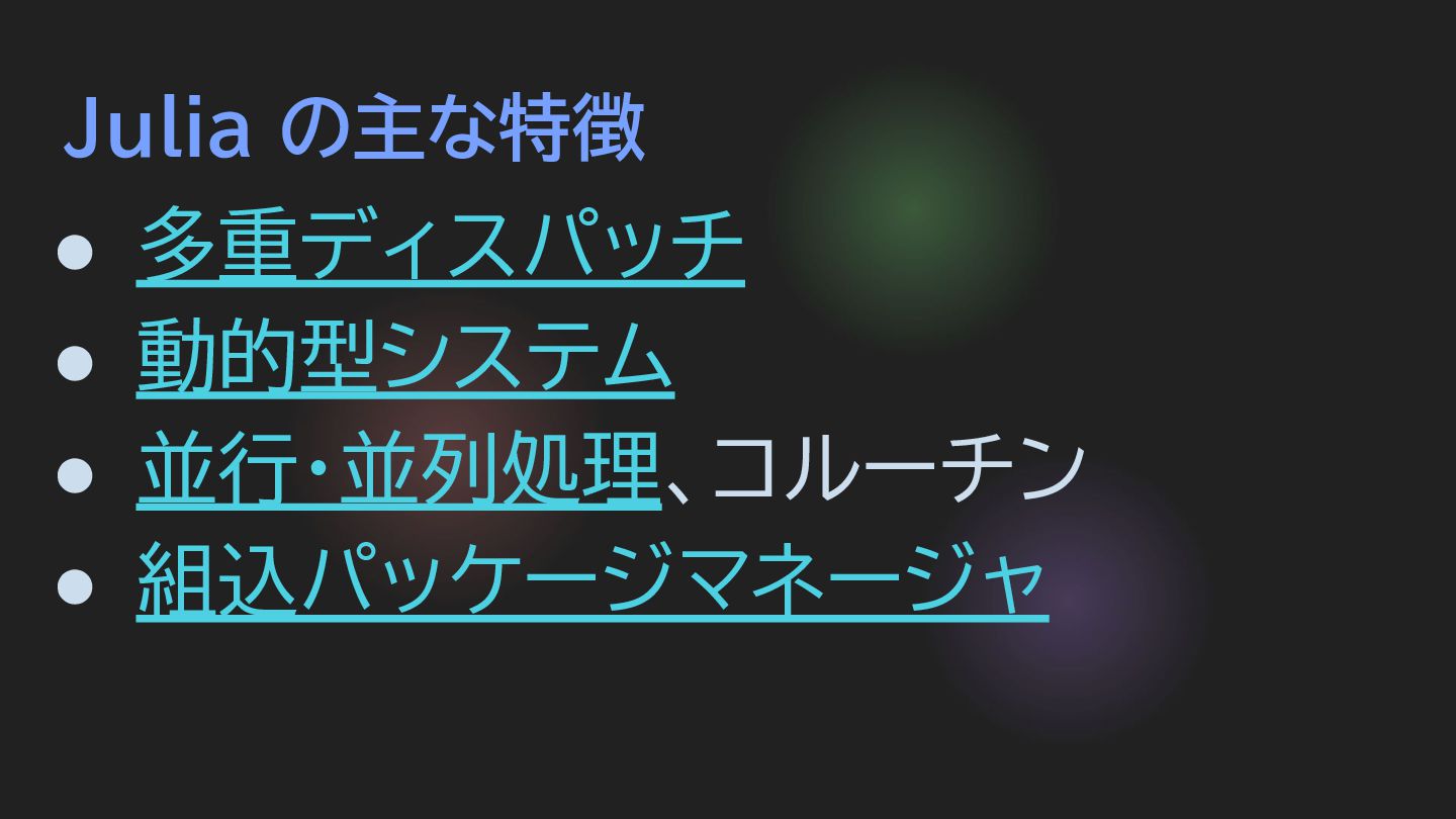 Julia の主な特徴 • 多重ディスパッチ • 動的型システム • 並行・並列処理、コルーチン • 組込パッケージマネージャ