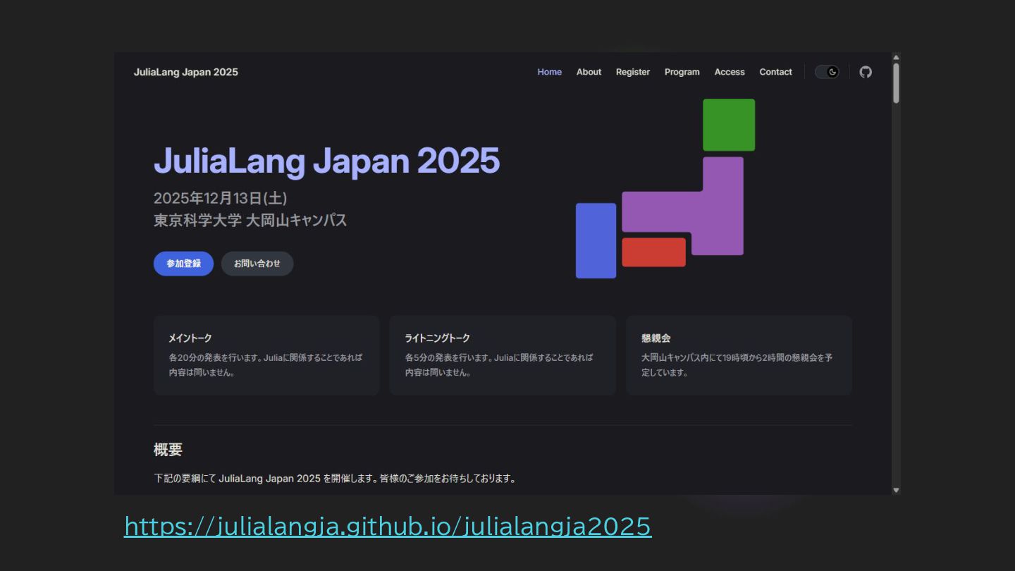所属・立場関係なくどなたでも! • 参加方式: オンサイト/Zoom(ハイブリッド開催) • 会場: 東京科学大学 大岡山キャンパス • 詳しくは 公式サイト を! JuliaLang Japan 2025
