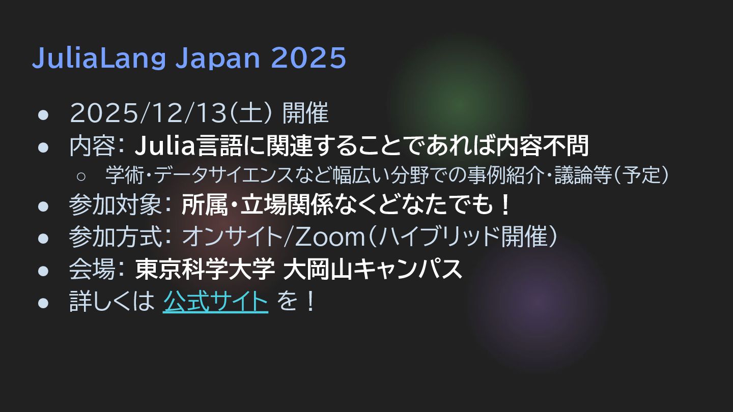 • 2025/12/13(土) 開催 • 内容: Julia言語に関連することであれば内容不問 ◦ 学術・データサイエンスなど幅広い分野での事例紹介・議論等(予定) • 参加対象: