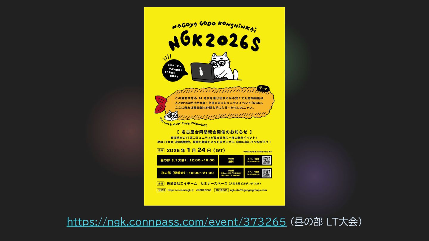 • イベント内容 ◦ 昼の部:LT大会(https://ngk.connpass.com/event/373265/) ◦ 夜の部:懇親会(https://ngk.connpass.com/event/373524/)(有料) • 参加対象: どなたでも! ◦ コミュニティ・スポンサー等は東海地区にゆかりのある方の参加優先となります • 参加方式: オンサイト/Youtube(配信視聴) • 会場: 株式会社エイチーム セミナースペース NGK2026S
