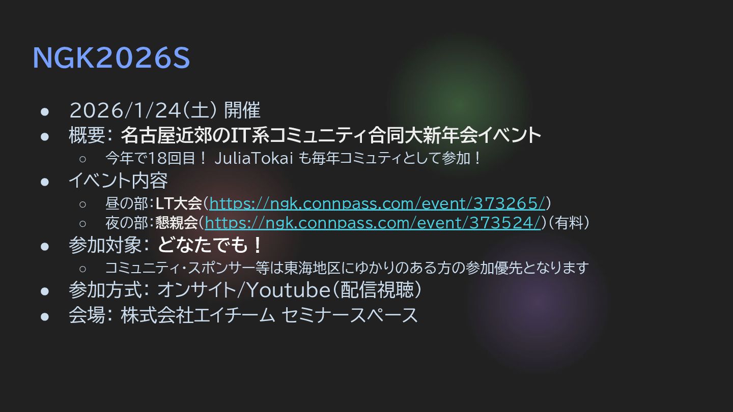 • 2026/1/24(土) 開催 • 概要: 名古屋近郊のIT系コミュニティ合同大新年会イベント ◦ 今年で18回目! JuliaTokai も毎年コミュティとして参加!