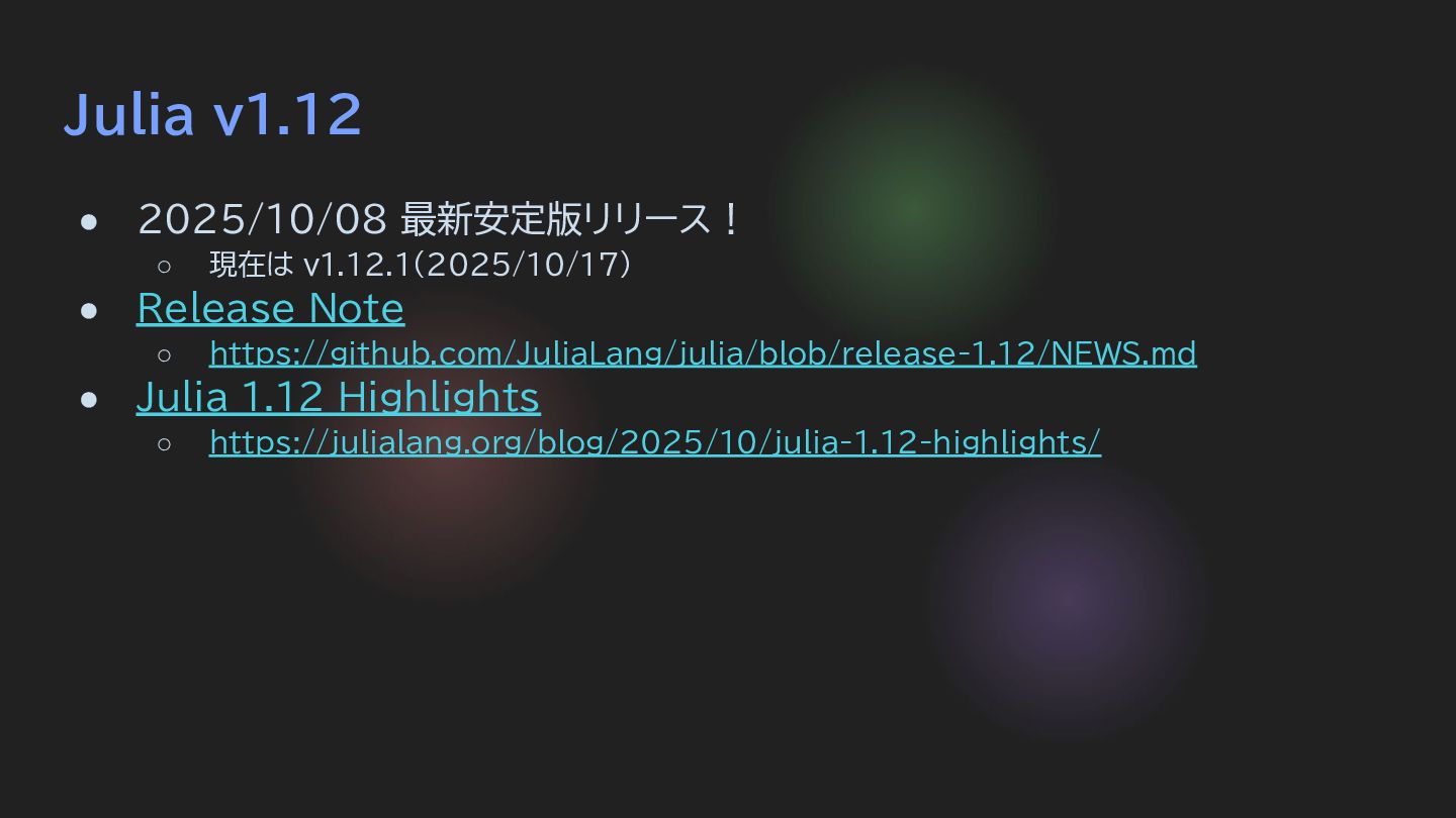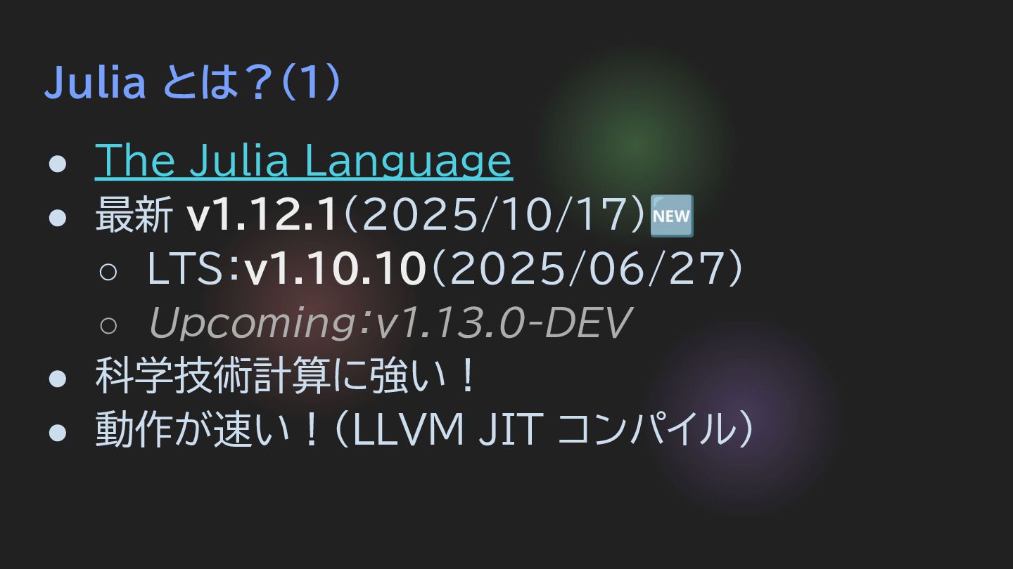 Julia とは?(1) • The Julia Language • 最新 v1.12.1(2025/10/17)🆕 ◦