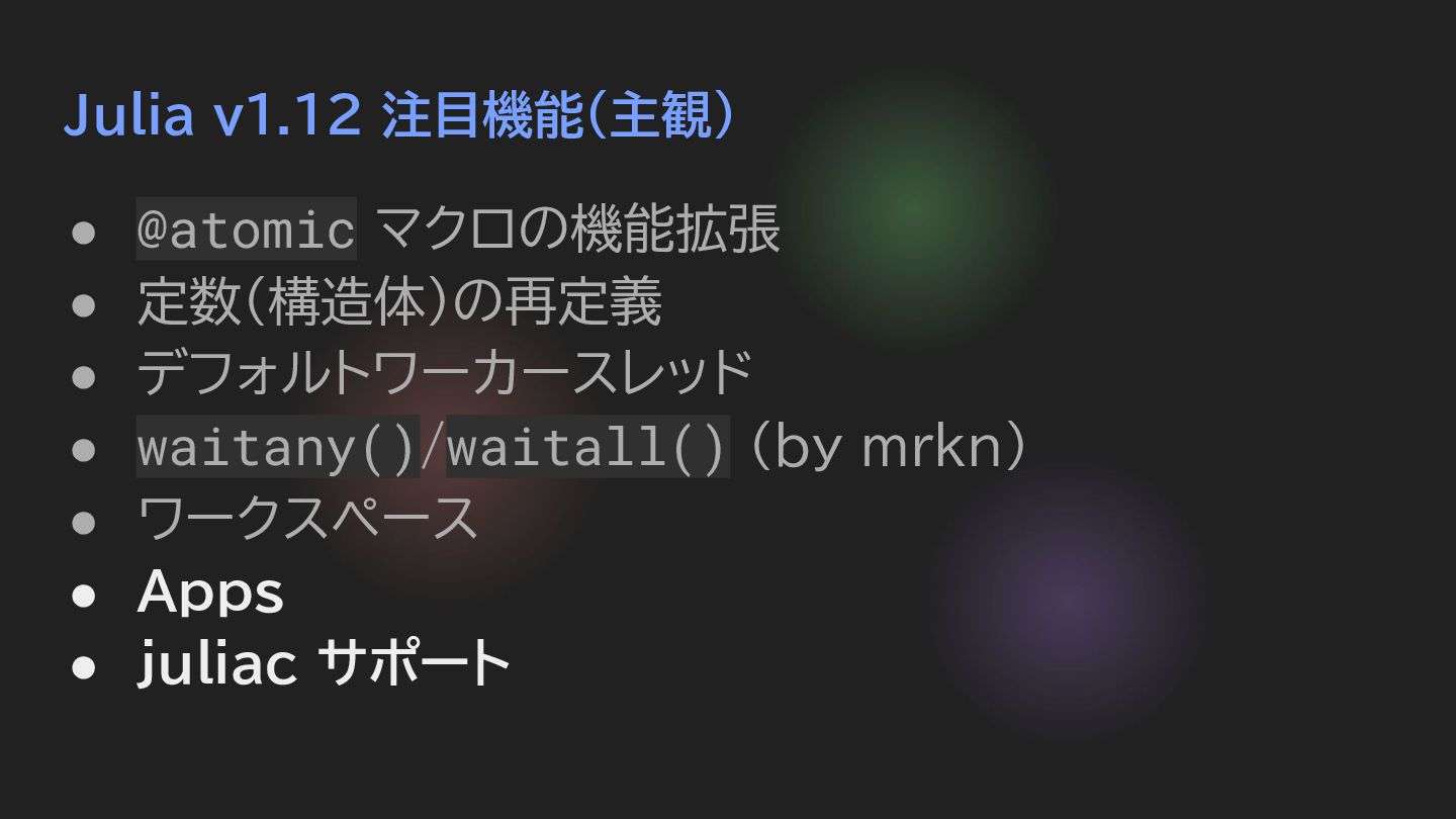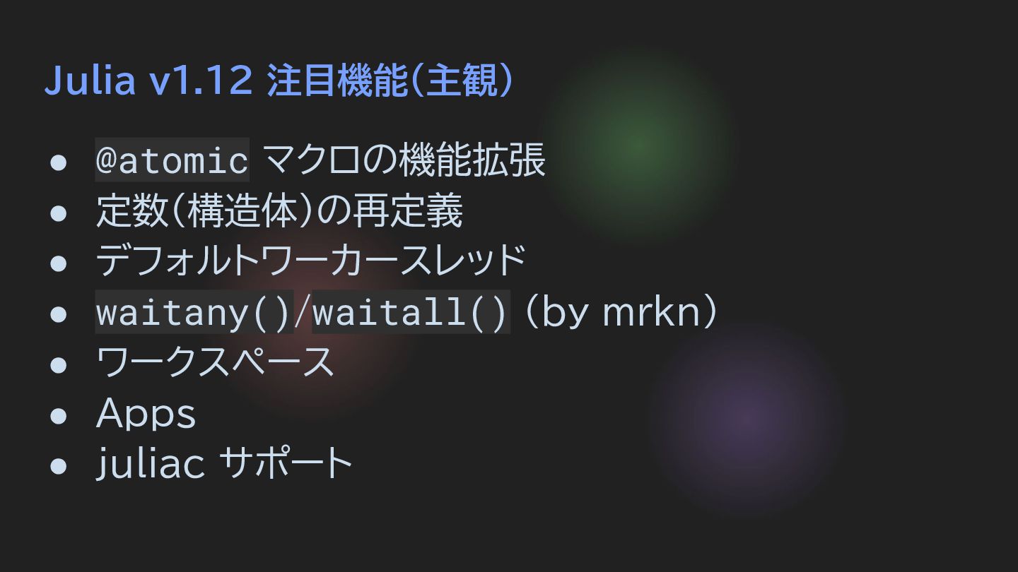 Julia v1.12 注目機能(主観) • @atomic マクロの機能拡張 • 定数(構造体)の再定義 • デフォルトワーカースレッド