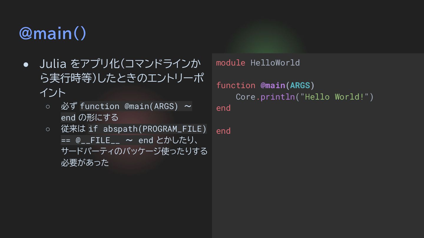 ~ end の形にする ◦ 従来は if abspath(PROGRAM_FILE) == @__FILE__ ~ end とかしたり、 サードパーティのパッケージ使ったりする 必要があった module HelloWorld function @main(ARGS) Core.println("Hello World!") end end
