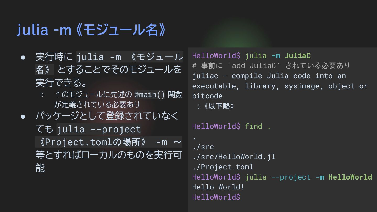 julia -m 《モジュール名》 • 実行時に julia -m 《モジュール 名》 とすることでそのモジュールを