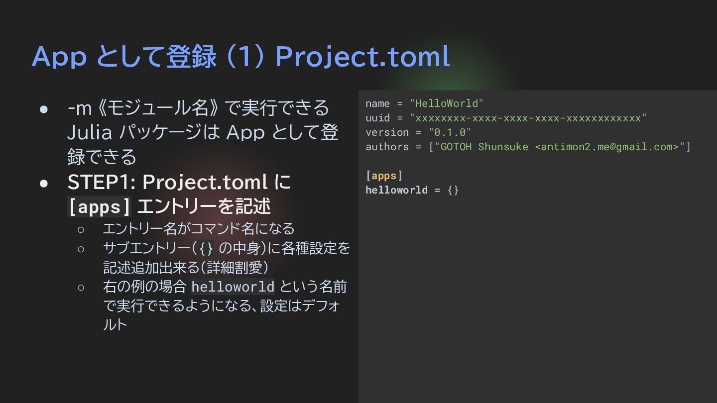 App として登 録できる • STEP1: Project.toml に [apps] エントリーを記述 ◦ エントリー名がコマンド名になる ◦ サブエントリー({} の中身)に各種設定を 記述追加出来る(詳細割愛) ◦ 右の例の場合 helloworld という名前 で実行できるようになる、設定はデフォ ルト name = "HelloWorld" uuid = "xxxxxxxx-xxxx-xxxx-xxxx-xxxxxxxxxxxx" version = "0.1.0" authors = ["GOTOH Shunsuke <
