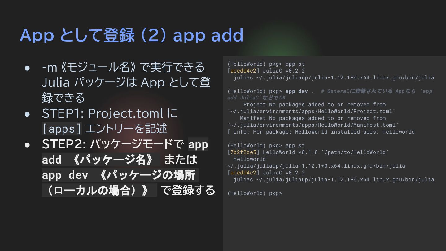 App として登録 (2) app add • -m 《モジュール名》 で実行できる Julia