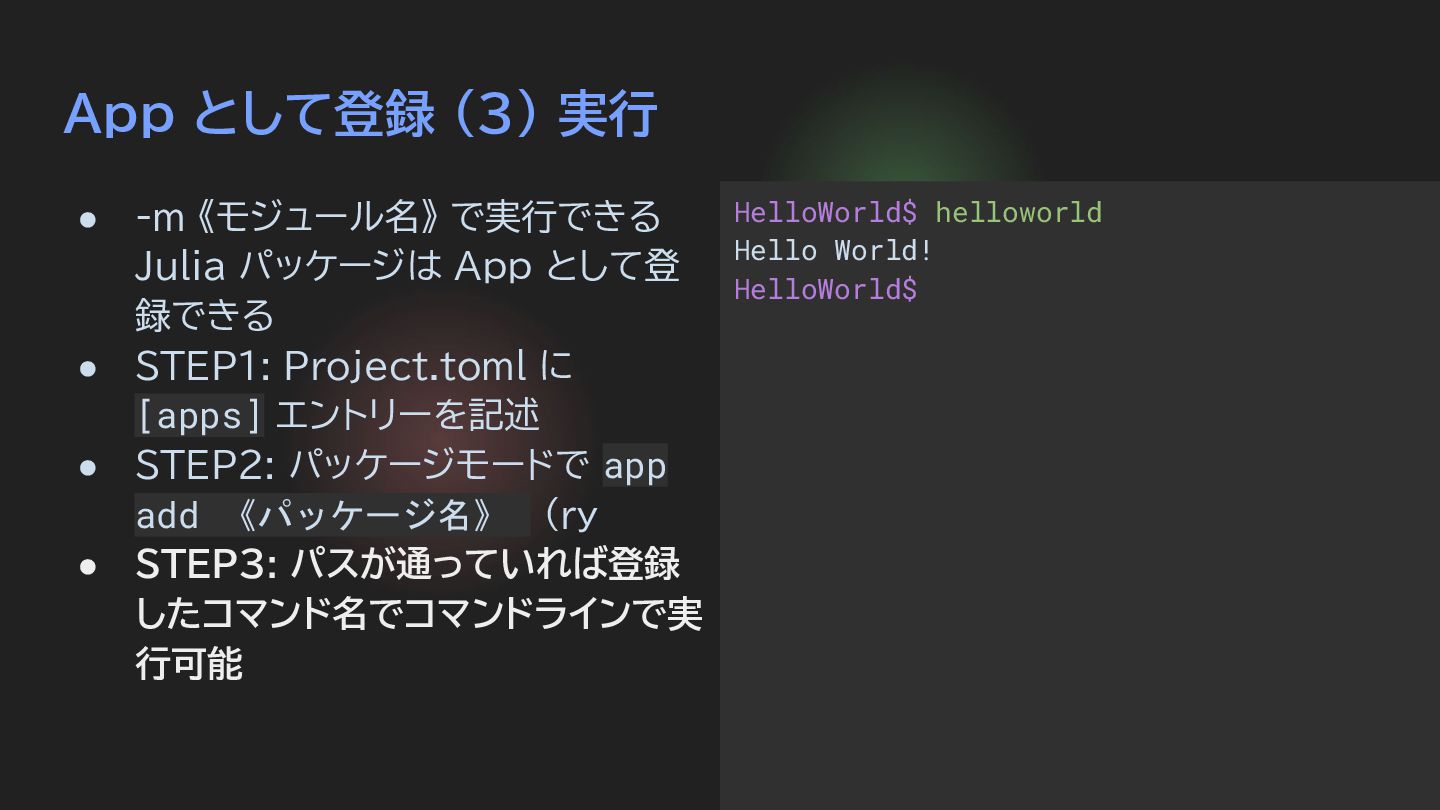 App として登 録できる • STEP1: Project.toml に [apps] エントリーを記述 • STEP2: パッケージモードで app add 《パッケージ名》 (ry • STEP3: パスが通っていれば登録 したコマンド名でコマンドラインで実 行可能 HelloWorld$ helloworld Hello World! HelloWorld$