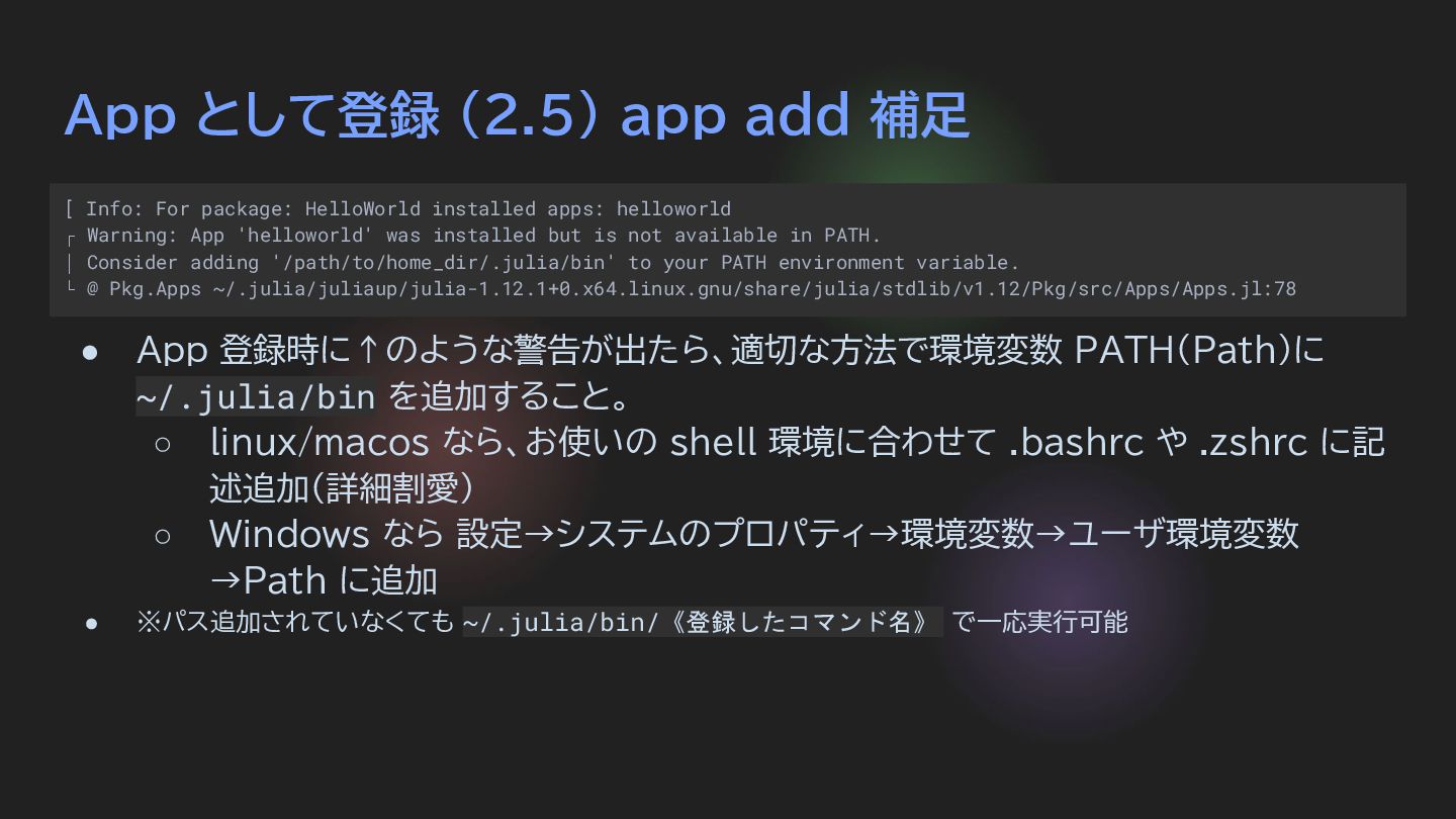 ~/.julia/bin を追加すること。 ◦ linux/macos なら、お使いの shell 環境に合わせて .bashrc や .zshrc に記 述追加(詳細割愛) ◦ Windows なら 設定→システムのプロパティ→環境変数→ユーザ環境変数 →Path に追加 • ※パス追加されていなくても ~/.julia/bin/《登録したコマンド名》 で一応実行可能 [ Info: For package: HelloWorld installed apps: helloworld ┌ Warning: App 'helloworld' was installed but is not available in PATH. │ Consider adding '/path/to/home_dir/.julia/bin' to your PATH environment variable. └ @ Pkg.Apps ~/.julia/juliaup/julia-1.12.1+0.x64.linux.gnu/share/julia/stdlib/v1.12/Pkg/src/Apps/Apps.jl:78