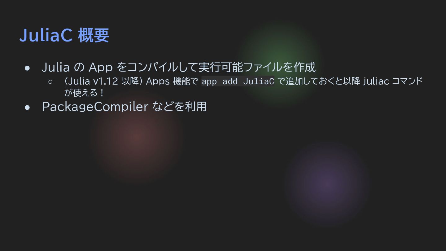 以降) Apps 機能で app add JuliaC で追加しておくと以降 juliac コマンド が使える! • PackageCompiler などを利用