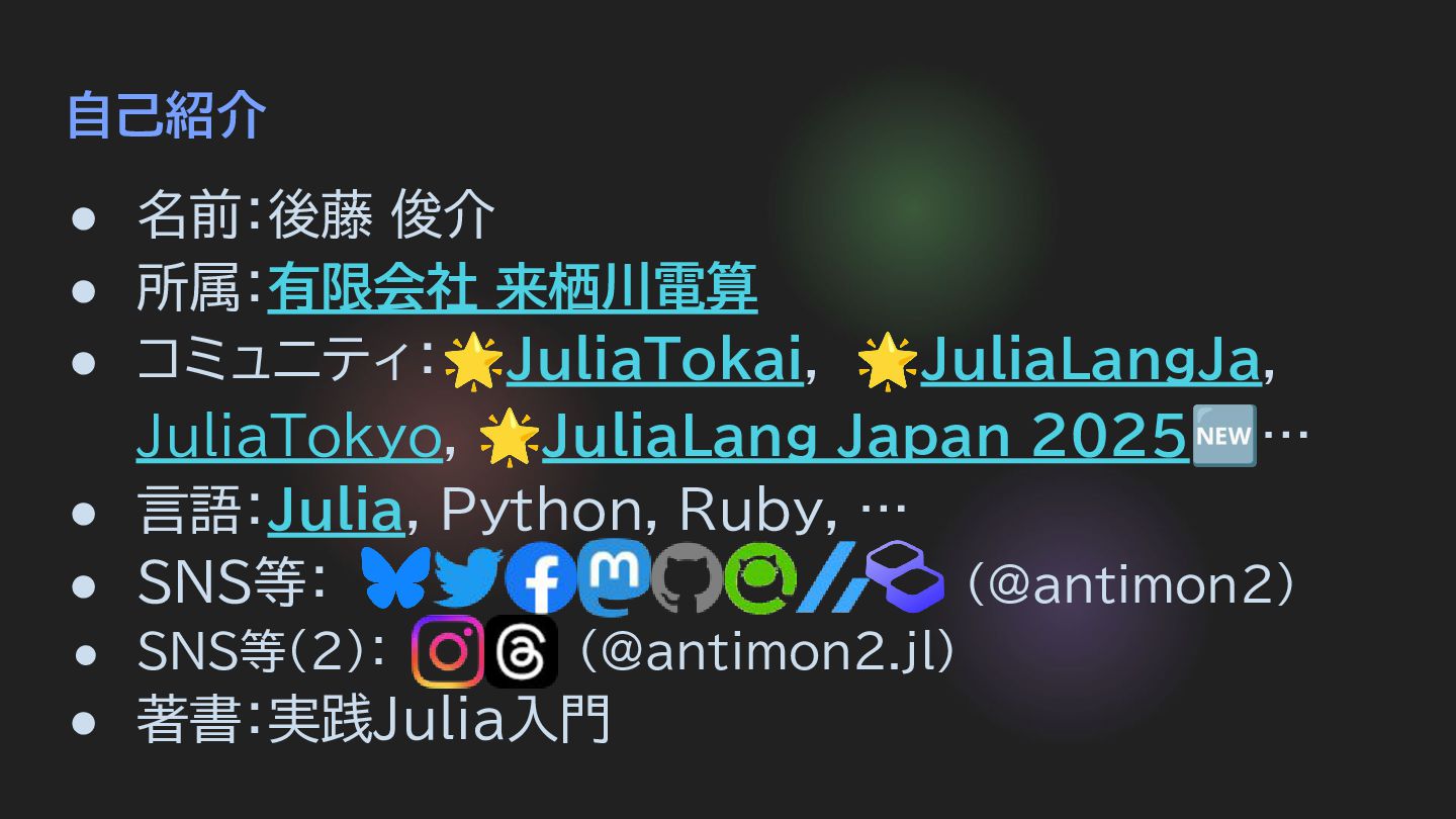 🌟JuliaLang Japan 2025🆕… • 言語:Julia, Python, Ruby, … • SNS等: (@antimon2) • SNS等(2): (@antimon2.jl) • 著書:実践Julia入門