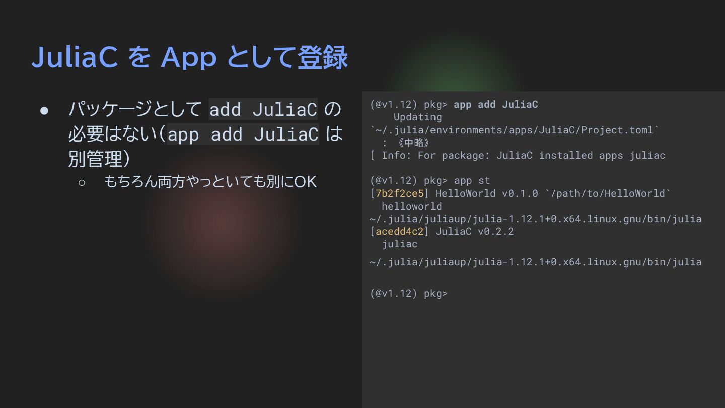 add JuliaC は 別管理) ◦ もちろん両方やっといても別にOK (@v1.12) pkg> app add JuliaC Updating `~/.julia/environments/apps/JuliaC/Project.toml` : 《中略》 [ Info: For package: JuliaC installed apps juliac (@v1.12) pkg> app st [7b2f2ce5] HelloWorld v0.1.0 `/path/to/HelloWorld` helloworld ~/.julia/juliaup/julia-1.12.1+0.x64.linux.gnu/bin/julia [acedd4c2] JuliaC v0.2.2 juliac ~/.julia/juliaup/julia-1.12.1+0.x64.linux.gnu/bin/julia (@v1.12) pkg>