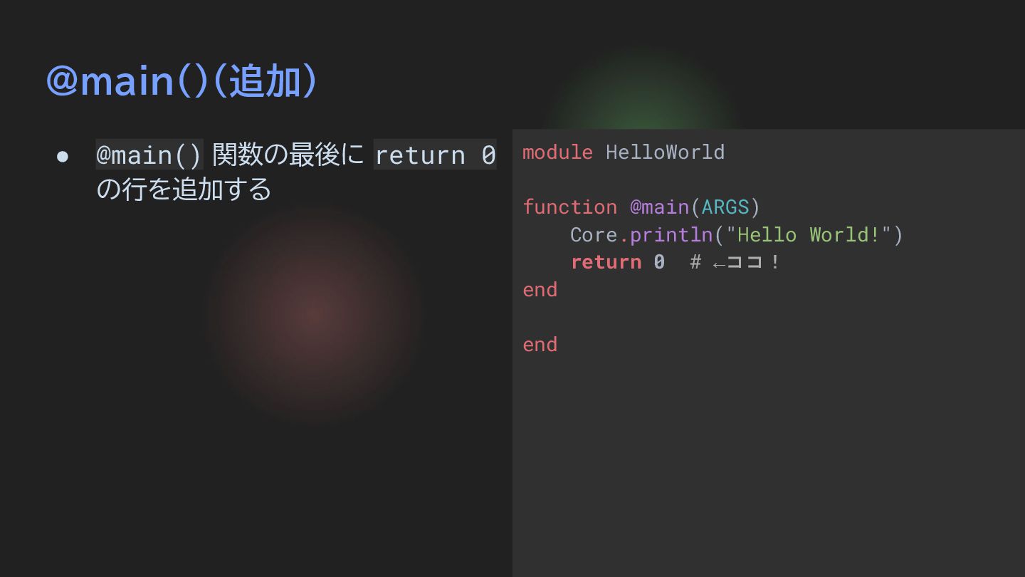 @main()(追加) • @main() 関数の最後に return 0 の行を追加する module HelloWorld function