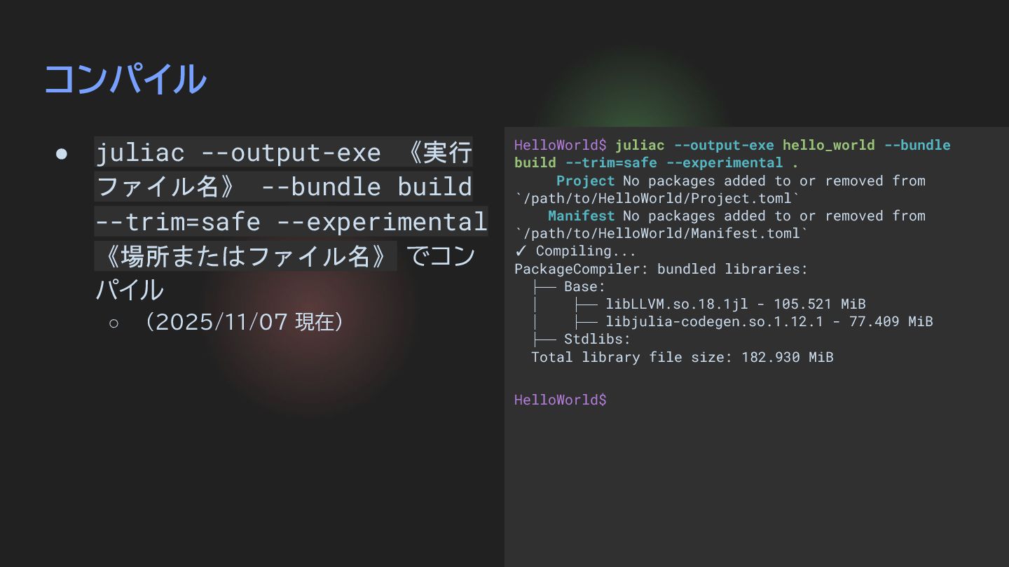 《場所またはファイル名》 でコン パイル ◦ (2025/11/07 現在) HelloWorld$ juliac --output-exe hello_world --bundle build --trim=safe --experimental . Project No packages added to or removed from `/path/to/HelloWorld/Project.toml` Manifest No packages added to or removed from `/path/to/HelloWorld/Manifest.toml` ✓ Compiling... PackageCompiler: bundled libraries: ├── Base: │ ├── libLLVM.so.18.1jl - 105.521 MiB │ ├── libjulia-codegen.so.1.12.1 - 77.409 MiB ├── Stdlibs: Total library file size: 182.930 MiB HelloWorld$