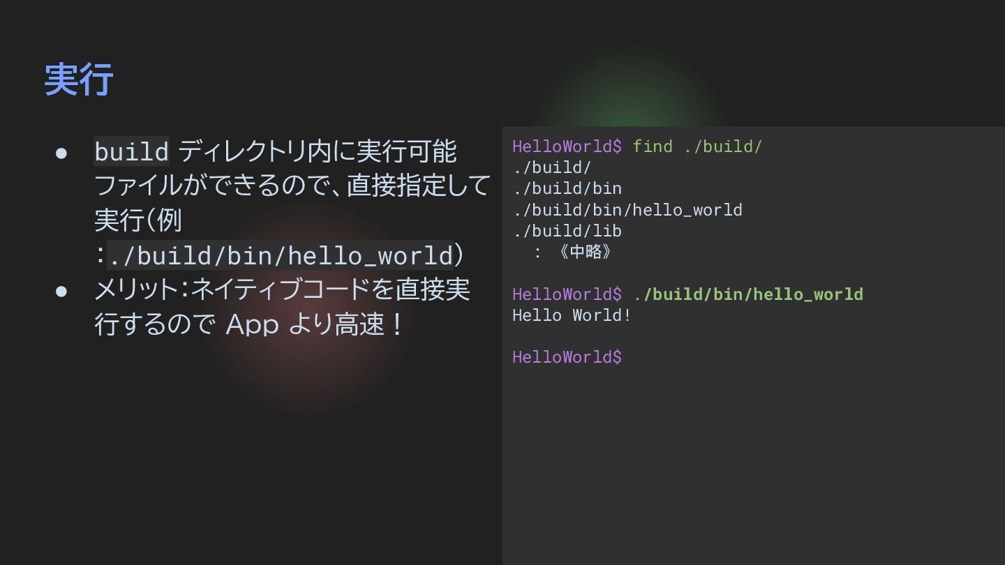実行 • build ディレクトリ内に実行可能 ファイルができるので、直接指定して 実行(例 :./build/bin/hello_world) • メリット:ネイティブコードを直接実 行するので