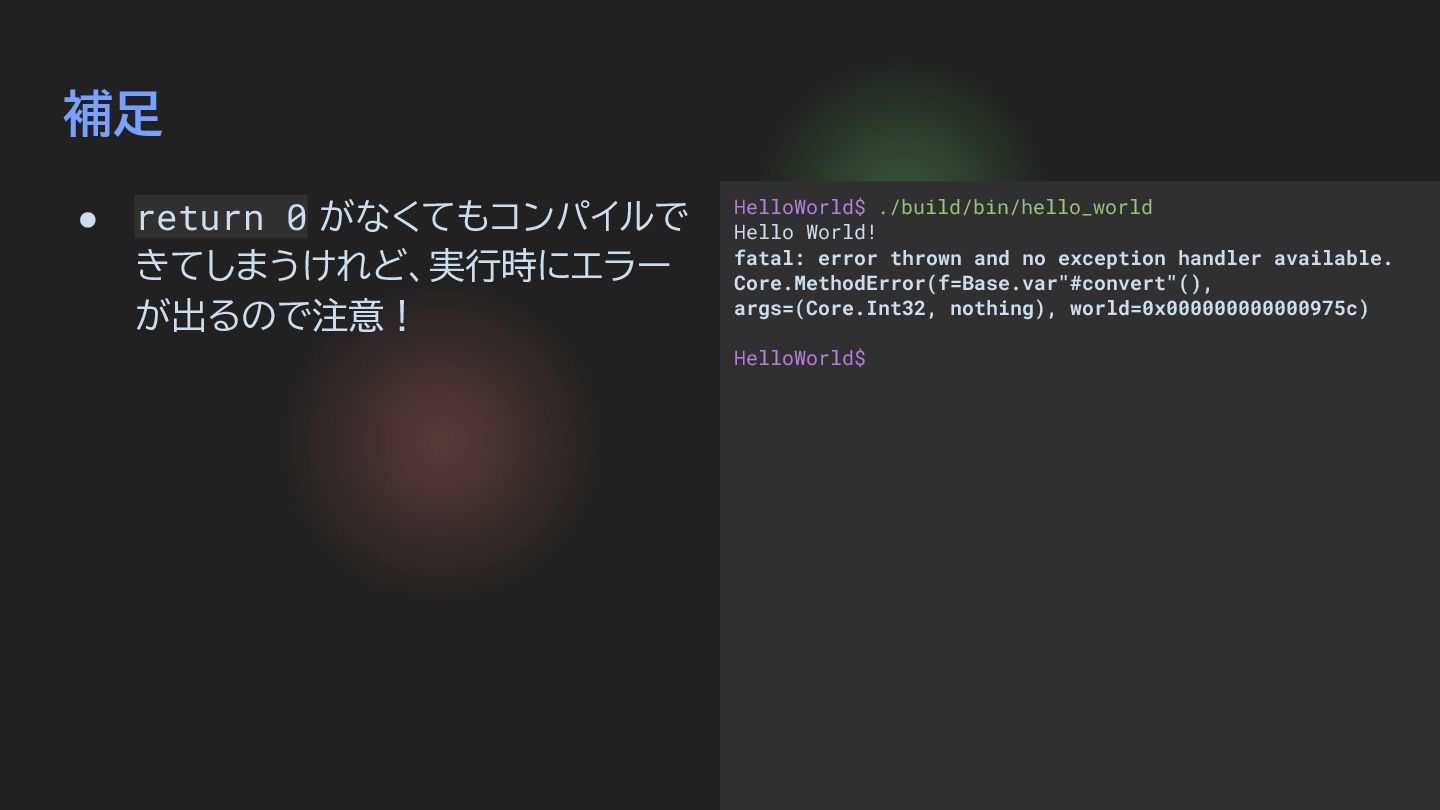 補足 • return 0 がなくてもコンパイルで きてしまうけれど、実行時にエラー が出るので注意! HelloWorld$ ./build/bin/hello_world Hello