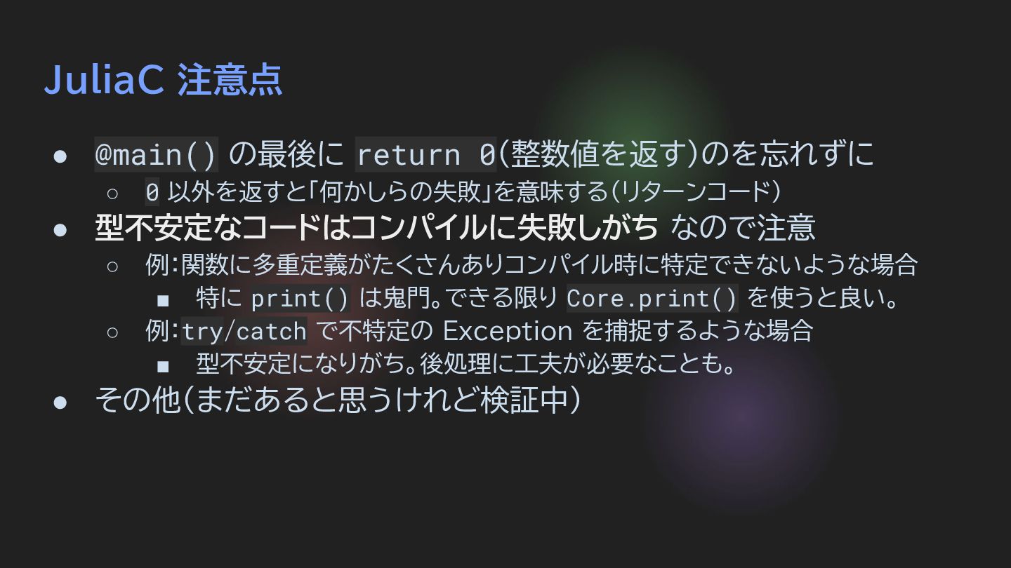 • 型不安定なコードはコンパイルに失敗しがち なので注意 ◦ 例:関数に多重定義がたくさんありコンパイル時に特定できないような場合 ▪ 特に print() は鬼門。できる限り Core.print() を使うと良い。 ◦ 例:try/catch で不特定の Exception を捕捉するような場合 ▪ 型不安定になりがち。後処理に工夫が必要なことも。 • その他(まだあると思うけれど検証中)