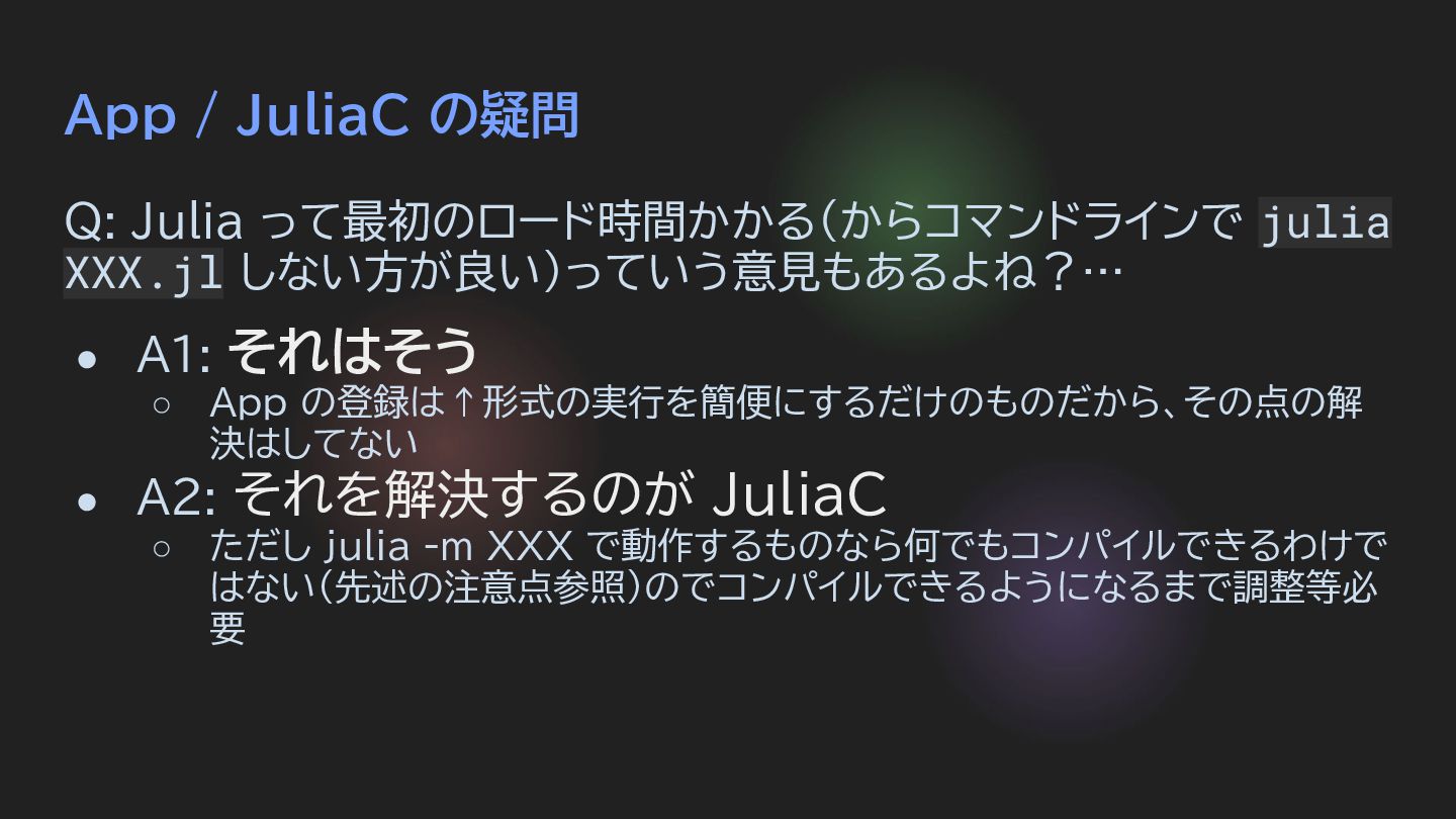 App / JuliaC の疑問 Q: Julia って最初のロード時間かかる(からコマンドラインで julia XXX.jl しない方が良い)っていう意見もあるよね?…
