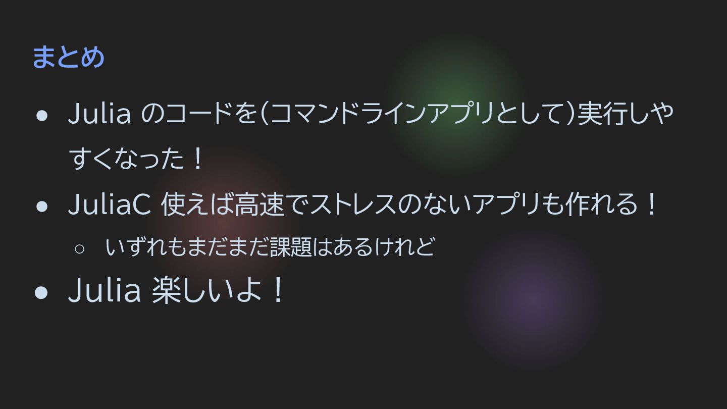 まとめ • Julia のコードを(コマンドラインアプリとして)実行しや すくなった! • JuliaC 使えば高速でストレスのないアプリも作れる! ◦ いずれもまだまだ課題はあるけれど
