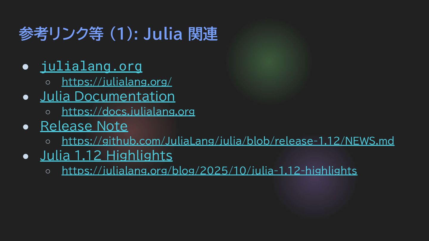 参考リンク等 (1): Julia 関連 • julialang.org ◦ https://julialang.org/ • Julia