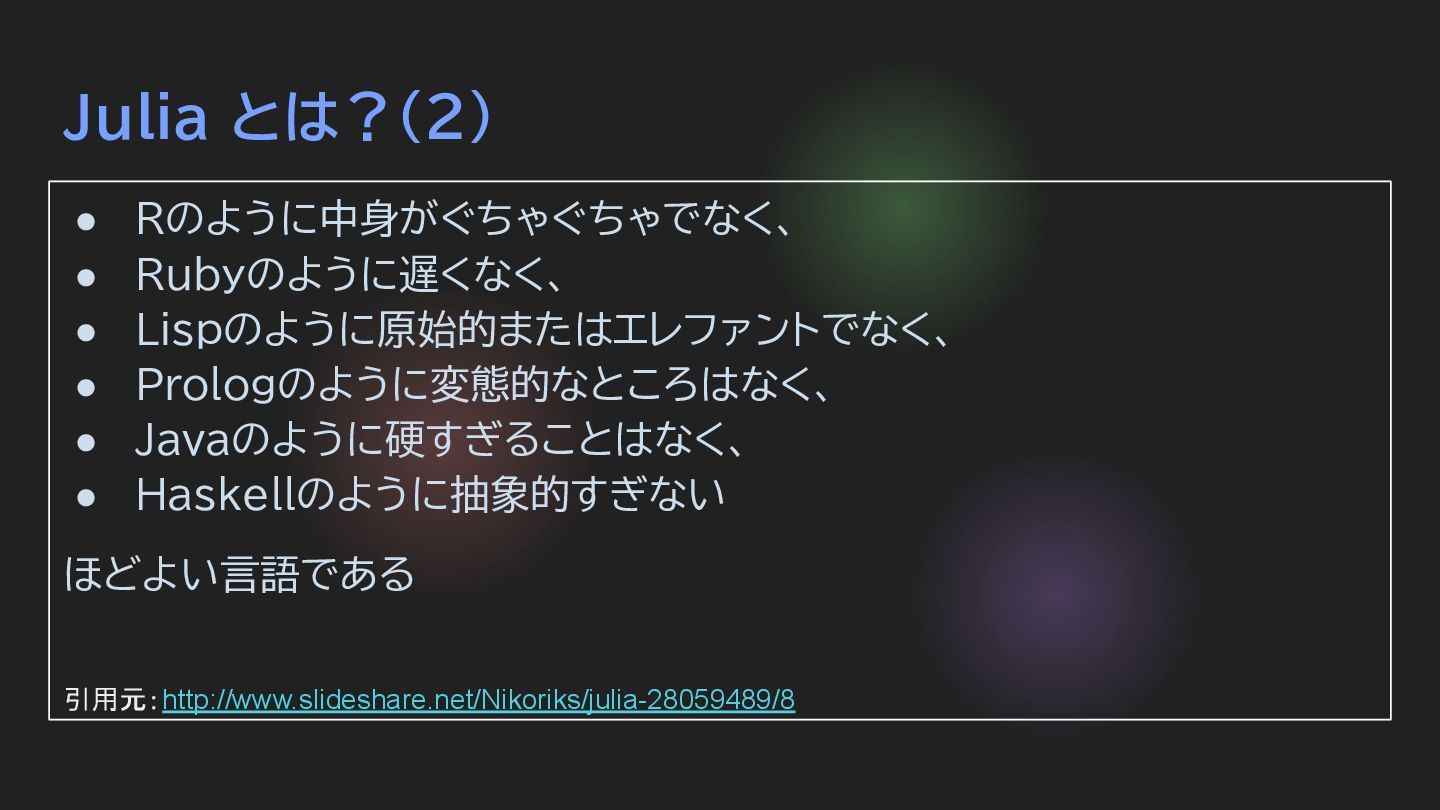 • Javaのように硬すぎることはなく、 • Haskellのように抽象的すぎない ほどよい言語である 引用元:http://www.slideshare.net/Nikoriks/julia-28059489/8