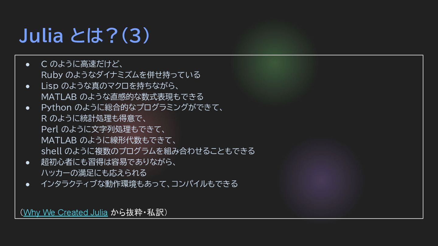 Julia とは?(2) • Rのように中身がぐちゃぐちゃでなく、 • Rubyのように遅くなく、 • Lispのように原始的またはエレファントでなく、 • Prologのように変態的なところはなく、