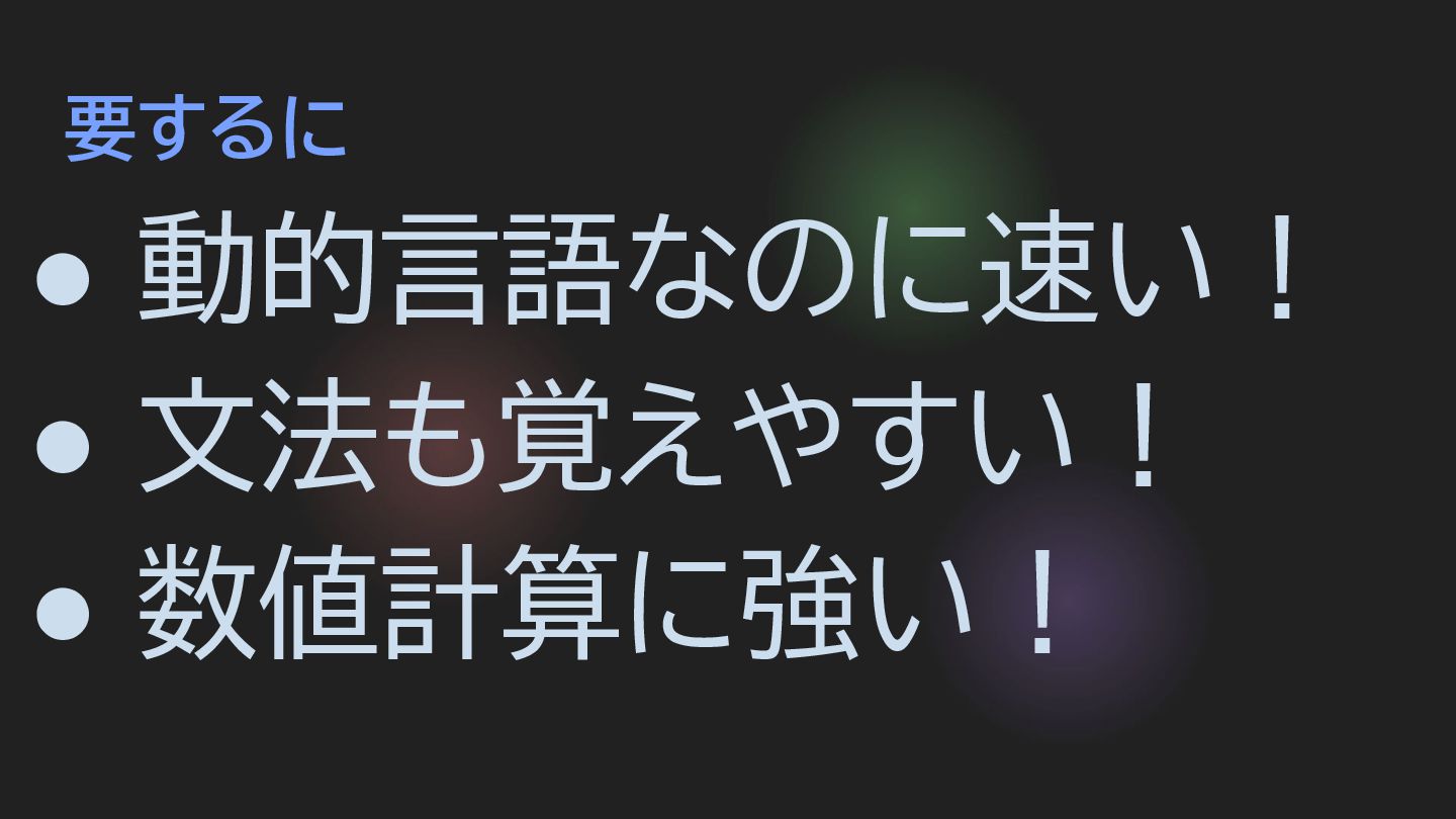 要するに • 動的言語なのに速い! • 文法も覚えやすい! • 数値計算に強い!