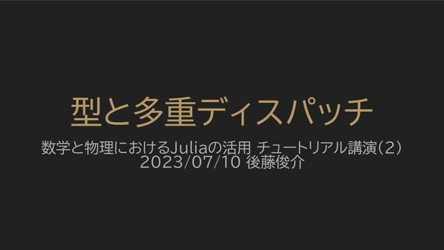場合は(変数の)型の指定 (変換に失敗するとエ ラー) • 代入時の右辺などの場合 は 型検査 (互換性のない 型だとエラー) • ※型ヒントではない! (重要) julia> let x::Int = sin(π) # == 0.0 なので変換されて 0 が代入される x end 0 julia> let x = (sin(π)::Int) # こちらはエラー(!(sin(π) <: Int) なので) x end ERROR: TypeError: in typeassert, expected Int64, got a value of type Float64 Stacktrace: [1] top-level scope @ REPL[XX]:2