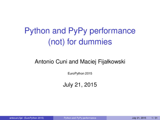 The talk will be given by Antonio Cuni and Maciej Fijalkowski, both long time PyPy core developers and expert in the area of Python performance.