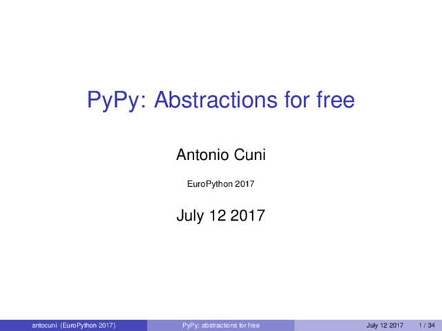 img i = x + y*w return data[i] def set(img, x, y, value): w, h, data = img i = x + y*w data[i] = value def sobel(img): w, h, data = img out = w, h, array.array(’B’, [0]) * (w*h) for y in xrange(1, h-1): for x in xrange(1, w-1): dx = (-1.0 * get(img, x-1, y-1) + 1.0 * get(img, x+1, y-1) + -2.0 * get(img, x-1, y) + 2.0 * get(img, x+1, y) + -1.0 * get(img, x-1, y+1) + 1.0 * get(img, x+1, y+1)) dy = ... ... antocuni (EuroPython 2017) PyPy: abstractions for free July 12 2017 13 / 34