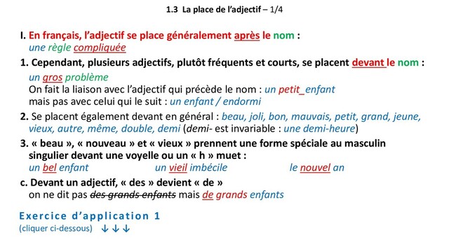 l’adjectif se place généralement après le nom : une règle compliquée 1. Cependant, plusieurs adjectifs, plutôt fréquents et courts, se placent devant le nom : un gros problème On fait la liaison avec l’adjectif qui précède le nom : un petit_enfant mais pas avec celui qui le suit : un enfant / endormi 2. Se placent également devant en général : beau, joli, bon, mauvais, petit, grand, jeune, vieux, autre, même, double, demi (demi- est invariable : une demi-heure) 3. « beau », « nouveau » et « vieux » prennent une forme spéciale au masculin singulier devant une voyelle ou un « h » muet : un bel enfant un vieil imbécile le nouvel an c. Devant un adjectif, « des » devient « de » on ne dit pas des grands enfants mais de grands enfants Exercice d’application 1 (cliquer ci-dessous) ↓ ↓ ↓
