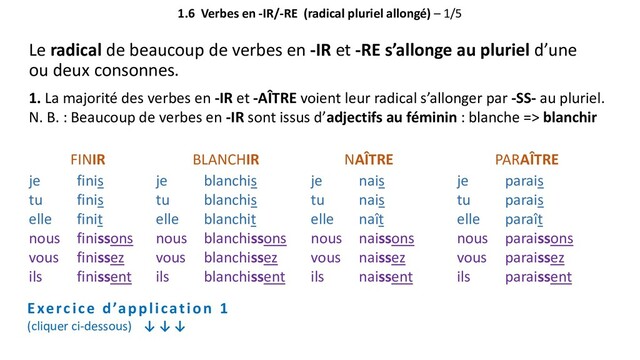 j’ instruis tu instruis elle instruit nous instruisons vous instruisez ils instruisent LIRE je lis tu lis elle lit nous lisons vous lisez ils lisent DIRE je dis tu dis elle dit nous disons vous dites ils disent 2. Les verbes en -UIRE ainsi que dire, lire et taire s’allongent au pluriel par -S. CONDUIRE je conduis tu conduis elle conduit nous conduisons vous conduisez ils conduisent SE TAIRE je me tais tu te tais elle se tait nous nous taisons vous vous taisez ils se taisent N. B. : dire est irrégulier à la 2e personne du pluriel, mais ses dérivés sont réguliers : contredire › vous contredisez interdire › vous interdisez Exercice d’application 2 (cliquer ci-dessous) ↓ ↓ ↓
