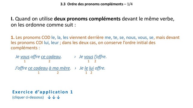 EN viennent toujours derrières les autres pronoms compléments : Pour Y, on conserve l’ordre initial : Je rencontre cet ami au cinéma. › Je l’y rencontre. 1 2 1 2 Mais pour EN, cela dépend : J’offre un cadeau à ma mère. › Je lui en offre un. 1 2 2 1 Y précède EN dans l’expression « il y en a ». Ailleurs, Y disparaît en face de EN. Il y a peu de grèves. › Il y en a peu. 1 2 1 2 { me, te, se, nous, vous, se } < { le, la, les } < { lui, leur } < y < en Exercice d’application 2 (cliquer ci-dessous) ↓ ↓ ↓