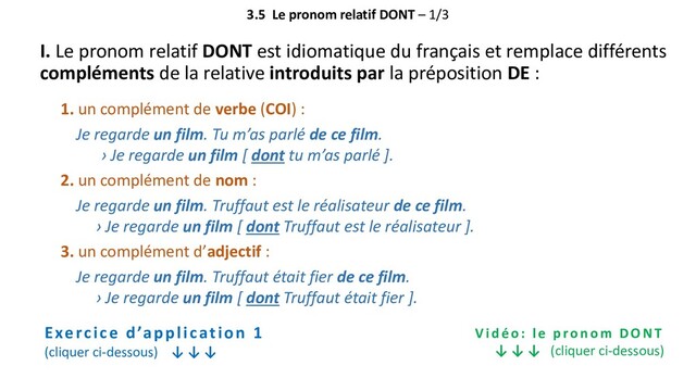 quel pronom relatif, lorsque le nom de référence est un nom propre, il faut exprimer au début de la relative la catégorie sémantique à laquelle ce nom propre appartient : J’adore Victor Hugo. Victor Hugo a écrit Les Misérables. › J’adore Victor Hugo, [ l’écrivain qui a écrit Les Misérables ]. J’ai vu Adèle H. Truffaut était fier d’Adèle H. › J’ai vu Adèle H, [ un film dont Truffaut était fier ]. Exercice d’application 2 (cliquer ci-dessous) ↓ ↓ ↓