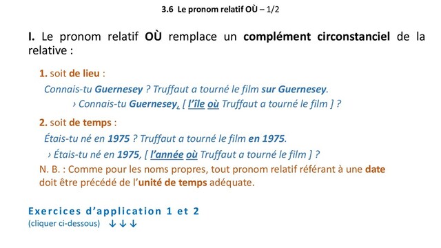 relatif OÙ remplace un complément circonstanciel de la relative : 1. soit de lieu : Connais-tu Guernesey ? Truffaut a tourné le film sur Guernesey. › Connais-tu Guernesey, [ l’île où Truffaut a tourné le film ] ? 2. soit de temps : Étais-tu né en 1975 ? Truffaut a tourné le film en 1975. › Étais-tu né en 1975, [ l’année où Truffaut a tourné le film ] ? N. B. : Comme pour les noms propres, tout pronom relatif référant à une date doit être précédé de l’unité de temps adéquate. Exercices d’application 1 et 2 (cliquer ci-dessous) ↓ ↓ ↓