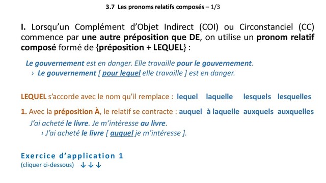 prépositions composées près de, à côté de, etc., on utilise près duquel, à côté duquel, etc. Là aussi, il faut faire les contractions : duquel de laquelle desquels desquelles Je te retrouve au magasin. L’autobus s’arrête en face du magasin. › Je te retrouve au magasin [ en face duquel l’autobus s’arrête ]. 3. Pour une chose ou une idée, on emploie {préposition + QUOI} Je sais cela. Tu penses à cela. › Je sais ce [ à quoi tu penses ]. Exercice d’application 2 (cliquer ci-dessous) ↓ ↓ ↓ V id éo: les p ron oms relatifs comp os és ↓ ↓ ↓ (cliquer ci-dessous)