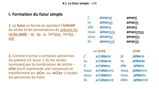 simple 1. Le futur se forme en ajoutant l’infinitif du verbe et les terminaisons du présent du verbe avoir : -ai, -as, -a, -(av)ons, -(av)ez, - ont j’ aimerai tu aimeras elle aimera nous aimerons vous aimerez ils aimeront amaré amarás amará amaremos amaréis amarán 2. Comme il arrive à certaines personnes du présent (cf. leçon 1.4), les verbes terminant par la combinaison de lettres - eCer (où C représente une consonne) se transforment en -èCer- ou -eCCer- à toutes les personnes du futur ACHETER j’ achèterai tu achèteras il achètera nous achèterons vous achèterez ils achèteront JETER je jetterai tu jetteras elle jettera nous jetterons vous jetterez elles jetteront