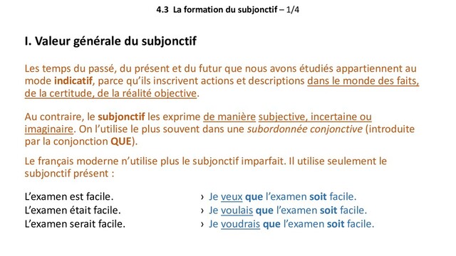 1. 4.3 La formation du subjonctif – 1/4 I. Valeur générale