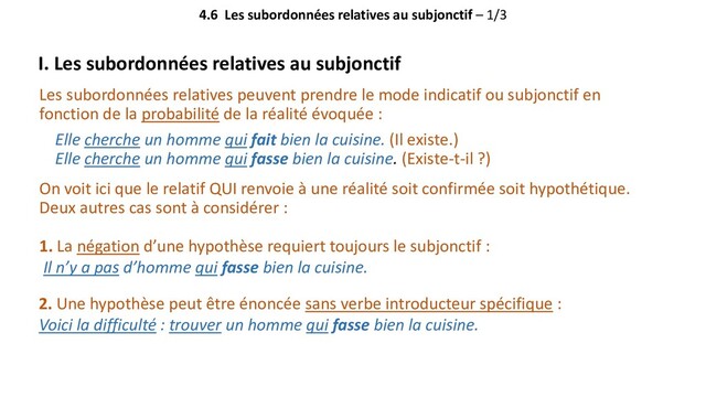 pronom relatif peut être suivi du subjonctif : 1. QUI : Personne ne veut me voir ? C’est ça, il n’y a personne qui veuille te voir. 2. QUE : Tu n’aimes rien ? C’est vrai, il n’y a rien que j’aime. 3. DONT : Ris-tu de tout ? Absolument, il n’y a rien dont je ne rie pas. 4. OÙ : Sa mort est-elle publiée sur tous les sites ? Oui, il n’y a pas de site où sa mort ne soit pas publiée. 5. AUQUEL : Parle-t-il à tous les employés ? En effet, il n’y a pas d’employé auquel il ne parle pas. 6. PRÉPOSITION + LEQUEL : Doit-on payer pour tous les invités ? Exactement, il n’y a pas d’invité pour lequel on ne doive pas payer ! II. Les différents pronoms relatifs et le subjonctif
